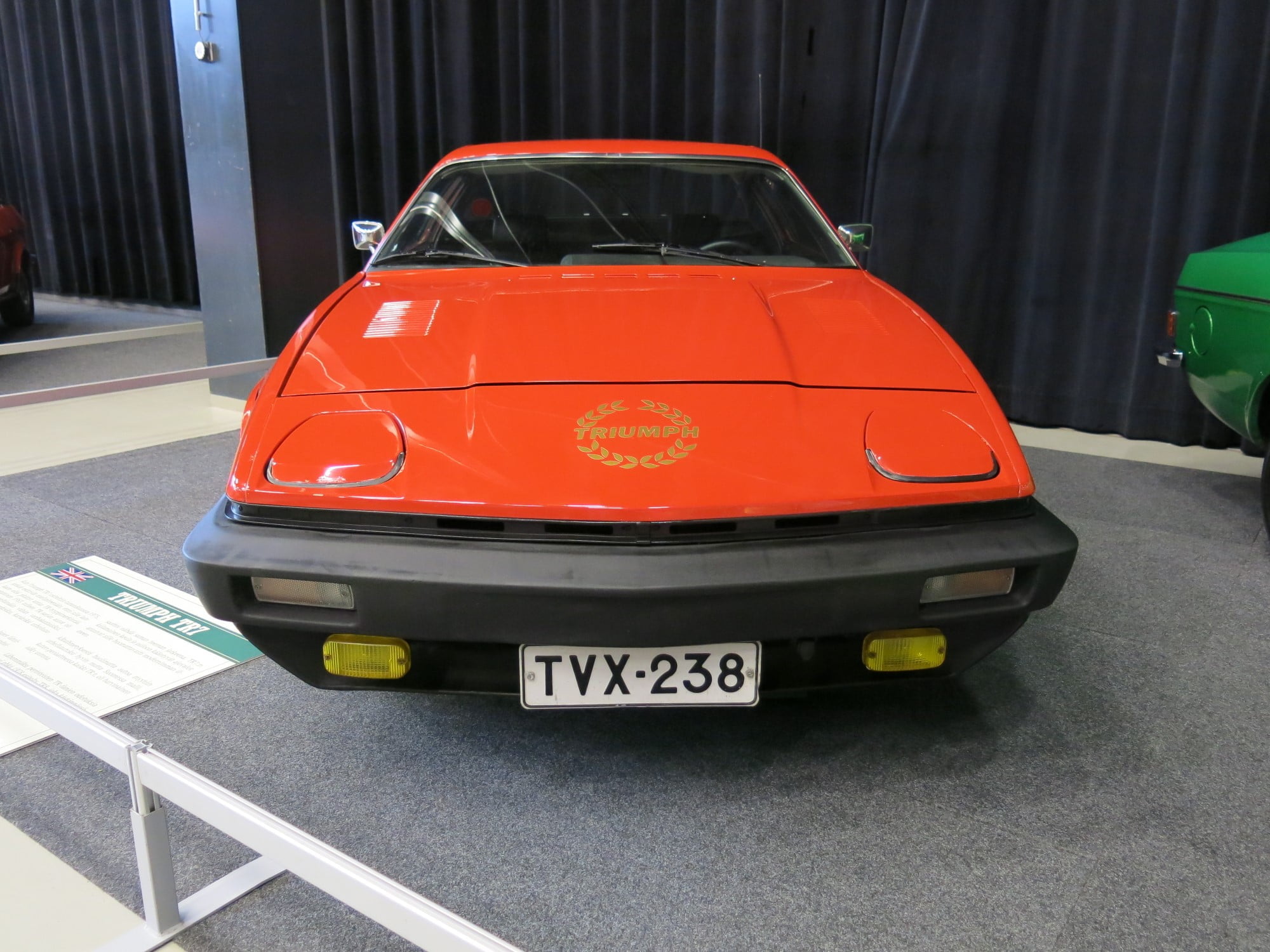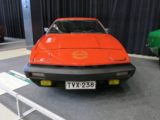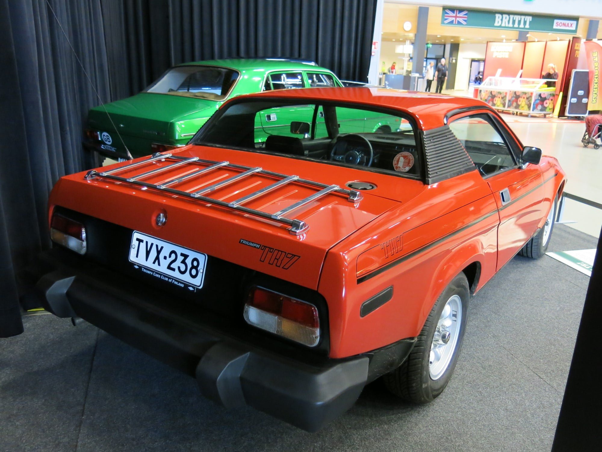 Kuvan auto, Triumph TR7 Coupé 1977, kuvattiin 2017 Classic Motorshow -tapahtumassa. Auton omistaja on Veijo Dillström.