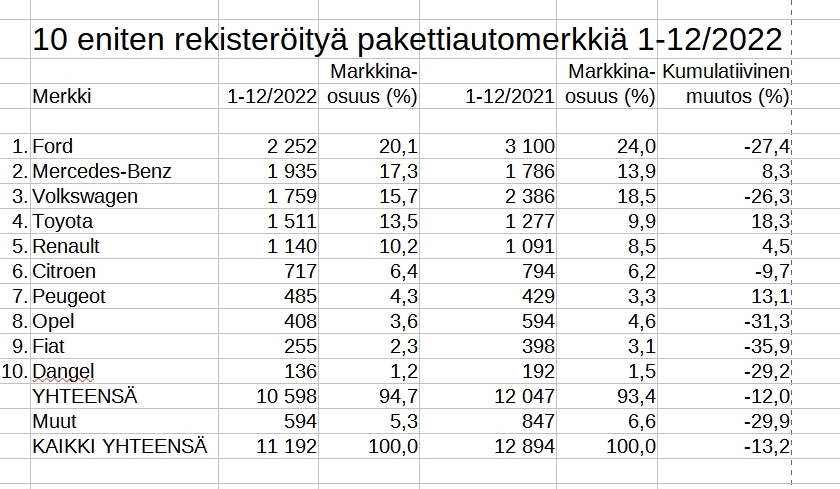 Ford pysyi kärjessä viime vuoden pakettiautojen rekisteröinneissä vaikka vähennys vuoteen 2021 oli merkittävä. Fordin pakettiautojen rekisteröinnit vähenivät 27,4 prosenttia ja autoja saatiin rekisteriin 848 vähemmän kuin 2021.