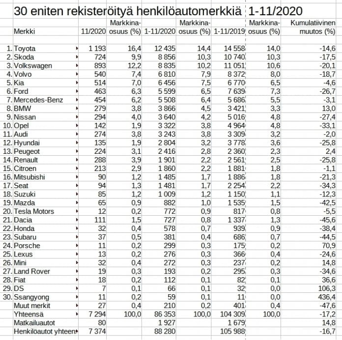 Kaikki kärkikolmikon merkit ovat tänä vuonna saaneet rekisteriin vähemmän autoja kuin viime vuoden vastaavana aikana. Näistä merkeistä kuitenkin Toyotan vähennys on kolmikon pienin ja näin kasvattanut eroa kilpailijoihiinsa. Toyotan markkinaosuus on marraskuun lopussa 14,4 prosenttia, kun se viime vuonna oli 14,0 prosenttia.