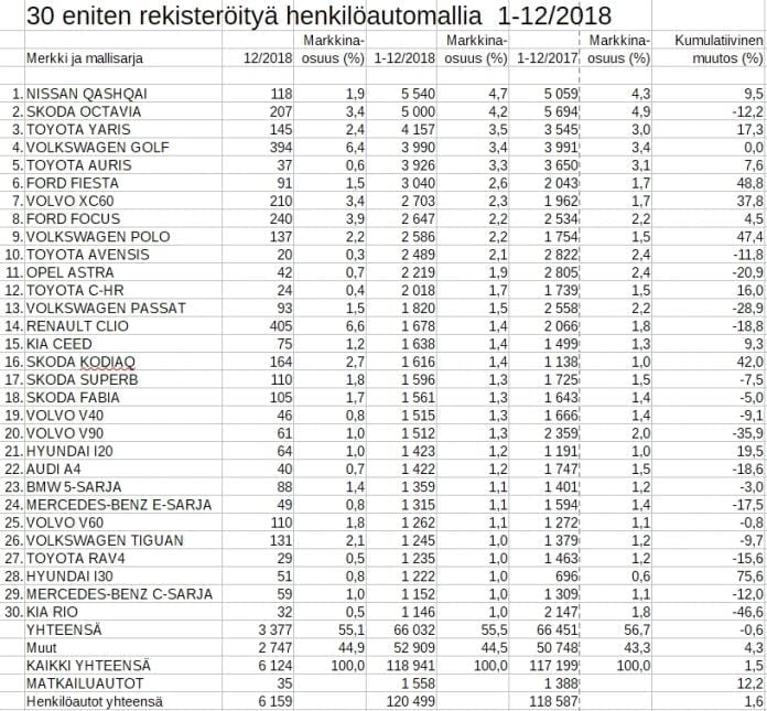 Toyota on suomen suosituin automerkki, koska 30 kärjessä on peräti viisi Toyotaa. Škodalla, Volkswagenilla ja Volvolla on kaikilla neljä merkkiä mukana.