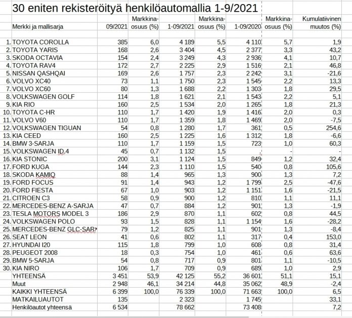 Toyota Corolla on aivan selvästi vielä Suomen suosituin automalli. Syyskuun loppuun mennessä rekisteriin on saatu 4 189 Corollaa.