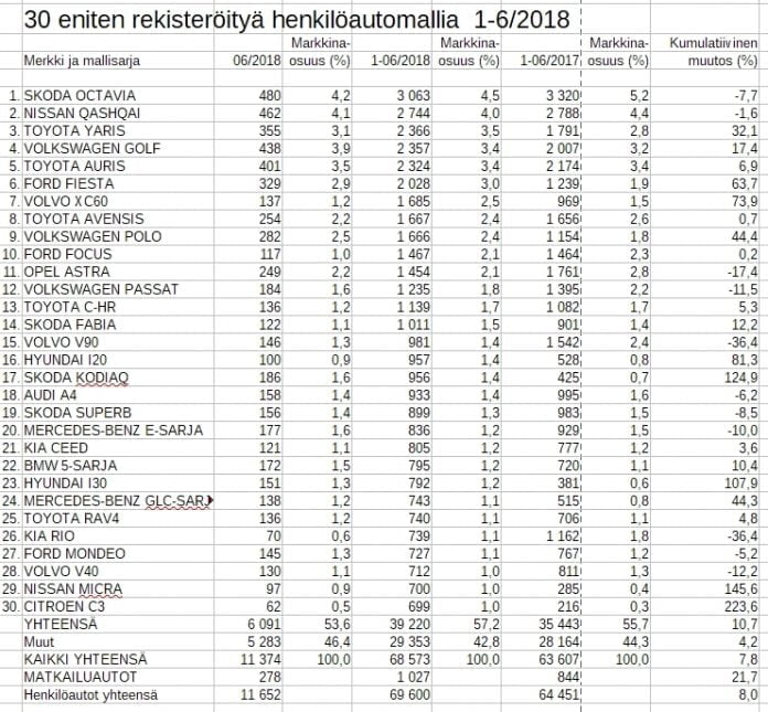 Ykkösenä olevan Škoda Octavian rekisteröintimäärä on nimittäin alkuvuonna pudonnut peräti 7,7 prosenttia viime vuoden vastaavaan aikaa verrattuna.