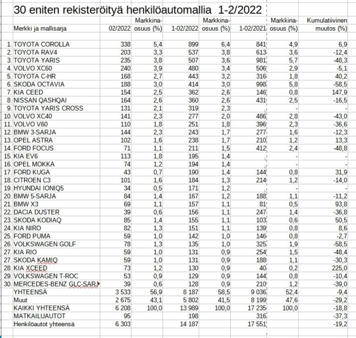 Corollaa on rekisteröity alkuvuonna 899 autoa, kun toisena tuleva Toyota RAV4 on lukemissa 537. Kolmantena oleva Toyota Yaris on saanut rekisteriin 507 autoa.