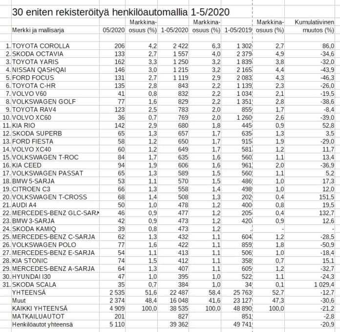Toyota Corolla oli toukokuunkin rekisteröintitilastoissa suosituin henkilöauto Suomessa. Corolla oli ainoa malli, jota rekisteröitiin yli 200 autoa toukokuun aikana.