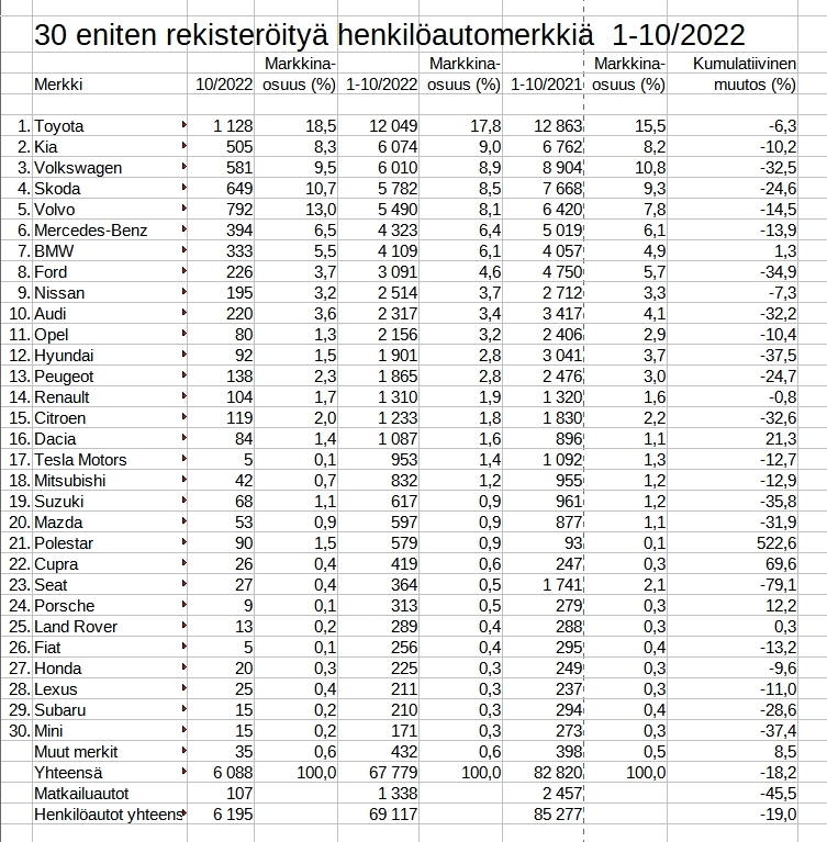 Toyotalla menee todella lujaa Suomessa. Lokakuussa Toyota-autoja rekisteröitiin taas selvästi eniten, ja alkuvuoden osalta rekisteröintimäärä on yli 12 000 autoa!