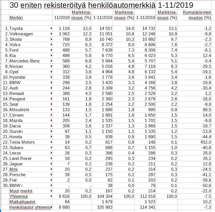 Toyota on aivan omassa luokassaan tämän vuoden henkilöautojen rekisteröintitilastossa, kun vuodesta on jäljellä enää yksi kuukausi. Toyotan markkinaosuus on tasan 14 prosenttia, eikä se ole ollut kymmeneen vuoteen näin suuri.