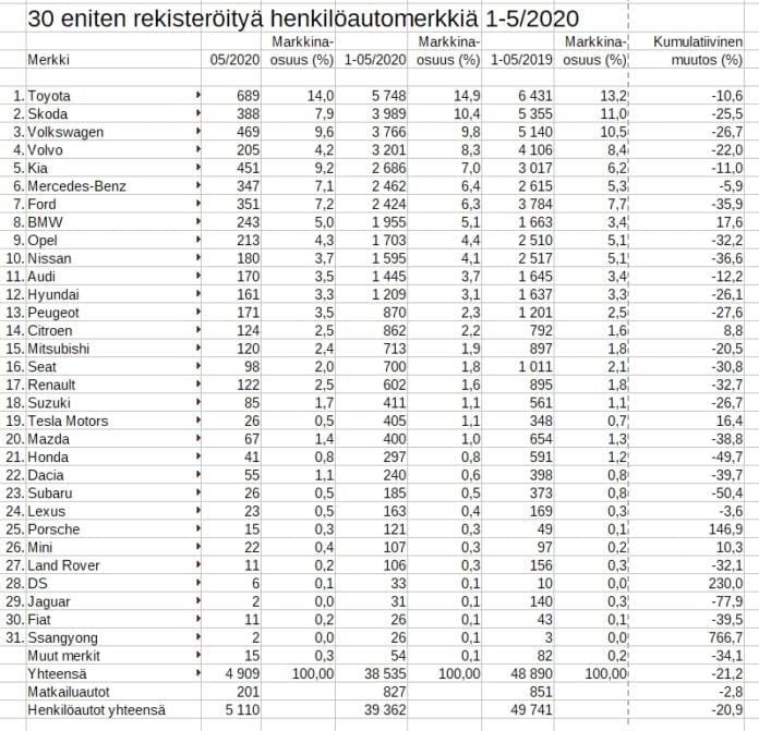 Kärjessä melkein 15 prosentin markkinaosuudella on Toyota. Merkkiä on vuoden viiden ensimmäisen kuukauden aikana rekisteröity 5 748 autoa.