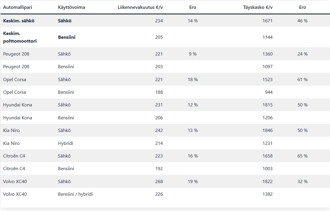- Kaikissa vertailuun valituissa automallipareissa sähköversio oli vakuutuksiltaan kalliimpi