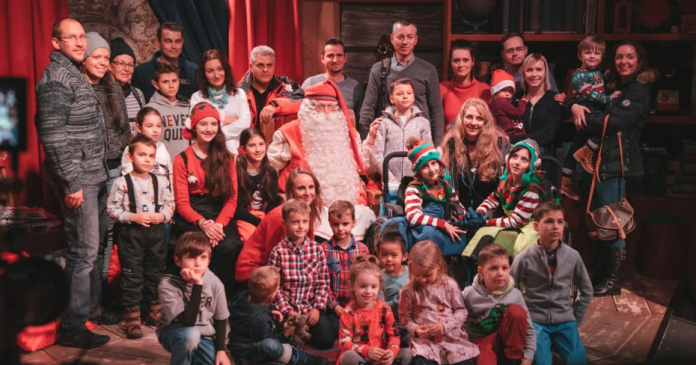 Perheet Joulupukin luona. Klikkaa nuolta nähdäksesi videon.