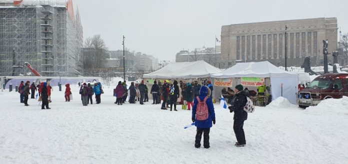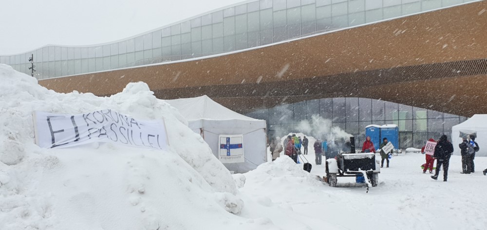 Perjantai-illan uhmakkaan Convoy-protestin enimmät höyryt tuntuivat lauantaina hiipuneen voimakkaan tuulen tuivertamana tuprunneeseen lumimyrskyyn. Liikenne Helsingin Mannerheimintiellä soljui iltapäivällä vielä normaaliin tapaan ja protestoijat tyytyivät leiriytymään kansalaistorille keskustakirjasto Oodin edustalle.