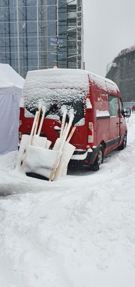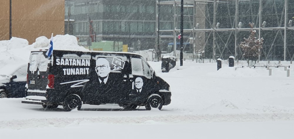 Perjantai-illan välillä myrskyisästä tunnelmasta muistuttivat kuitenkin hangen alle jääneet autot, joista moni oli saanut tuulilasiinsa pysäköintivirhemaksun. Iskulausein ja Suomen lipuin koristeltuja autoja löytyi edelleen ympäri viereisen Töölön kadunvarsia. Lumisade peitti vähitellen alleen edellisen illan iskulausekylttejä ja Mannerheimintieltä kansalaistorille siirrettyjä autoja.