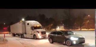 Video: Huima temppu – Tesla hinaa lumeen juuttuneen Volvo-rekan