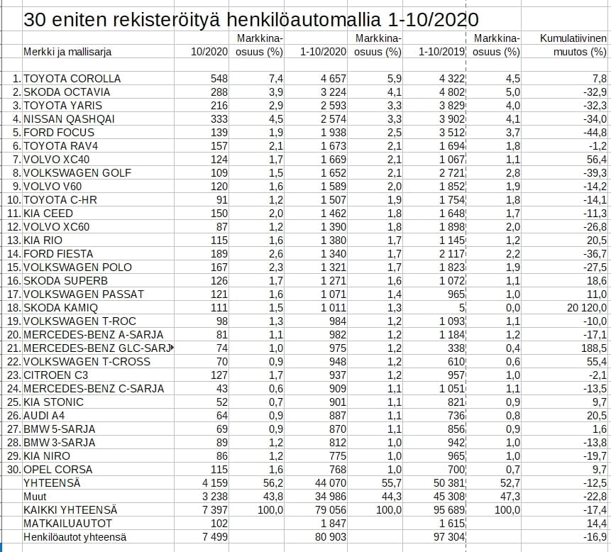 Rekisteröinti: Yksikään muu malli ei uhkaa Toyota Corollan ykköspaikkaa