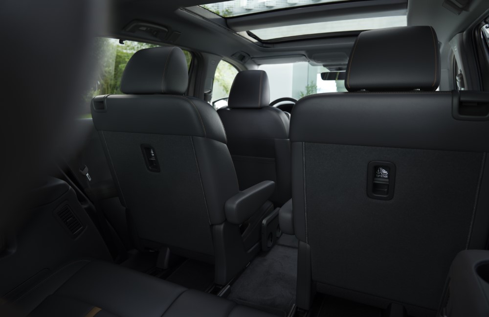 Peräti 25 senttiä pidemmän akselivälin takia CX-80:ssa on keskirivillä enemmän tilaa kuin CX-60:ssa. Myös tavaratila joustaa kuljetustarpeiden mukaan. Kaikki istuinpaikat käytössä tavaratila vetää vielä 258 litraa. Kun kolmannen rivin istuimien selkänojat taitetaan alas, tila kasvaa 687 litraan.