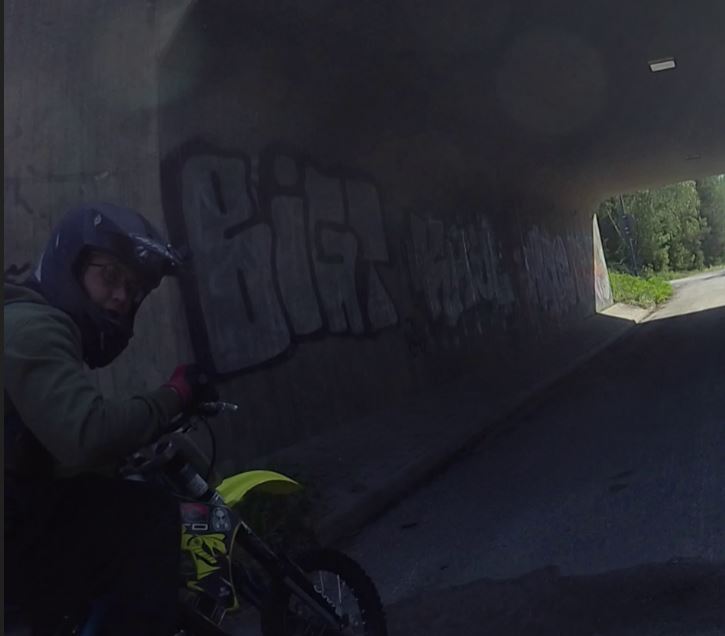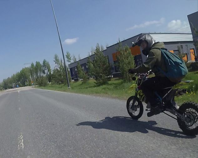 – Epäilty kuljettaja ajoi Minicross – tyyppistä moottoripyörää, missä on jatkettu takahaarukka. Hänellä oli yllään mattamusta Airoh-merkkinen crossikypärä, vihreä huppari, mustat kengät ja mustat housut. Selässä epäillyllä oli turkoosi reppu, kertoo Lehti.