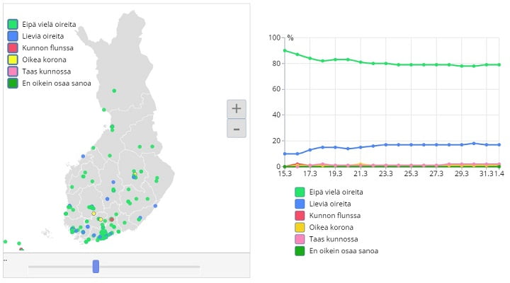 Vaustausten perusteella näyttää siltä, että korona ei ole vielä laajalti levinnyt. Melkein 80 % vastauksista on kohdassa ”Ei vielä oireita”.