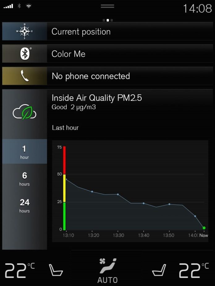 Volvo -kuljettajat voivat Volvo On Call -älypuhelinsovelluksella myös ajastaa auton sisäilman ylimääräisen puhdistuksen ennen matkan alkua. Sovellus ilmoittaa kuljettajalle matkustamon todellisen PM 2.5 -tason puhdistuksen jälkeen.