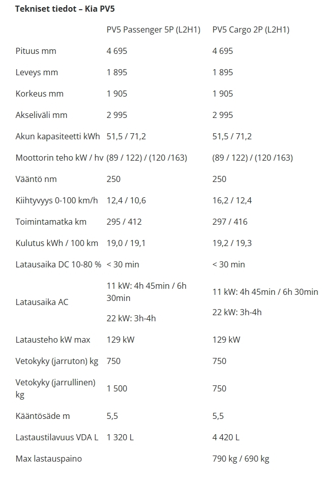 Vastaavasti hyötyajoneuvoversio PV5 Cargon hinnat alkavat 51,5 kWh:n akustolla 43 390 eurosta, ja pitkän kantaman akustolla vastaavasti 47 490 eurosta. Hinnat ovat ilmoitettu 25,5 % ALV:llä. Autot ovat mallia L2H1.